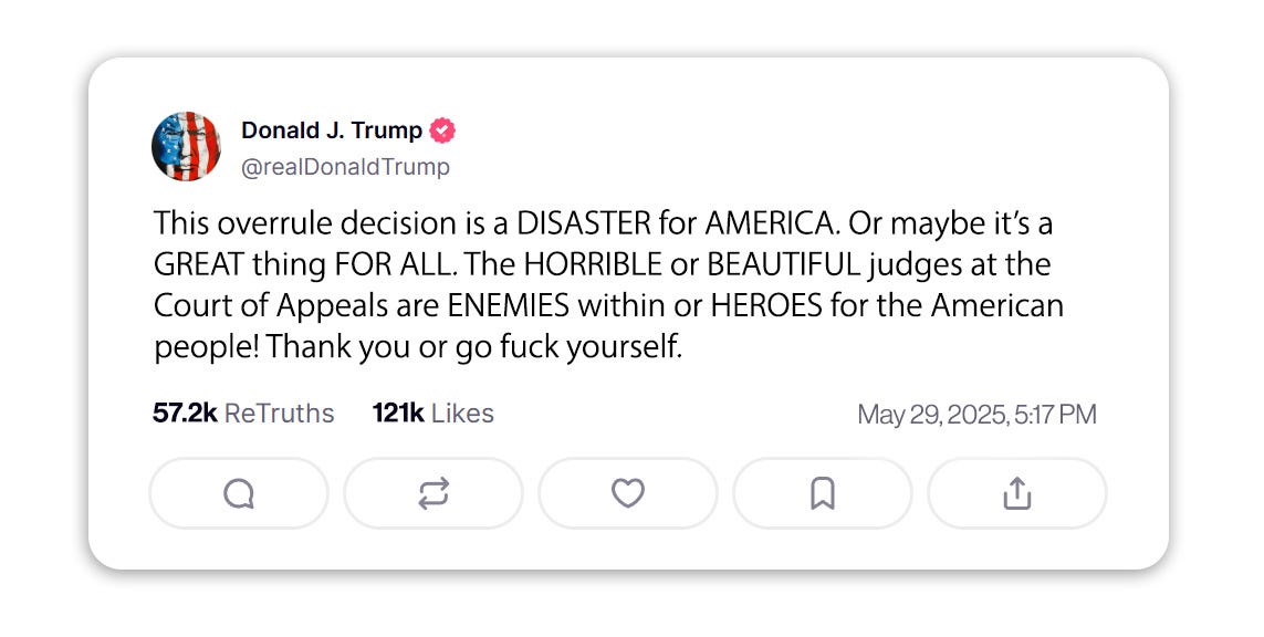 “This overrule decision is a DISASTER for AMERICA. Or maybe it’s a GREAT thing FOR ALL. The HORRIBLE or BEAUTIFUL judges at the Court of Appeals are ENEMIES within or HEROES for the American people! Thank you or go fuck yourself.” Trump wrote.