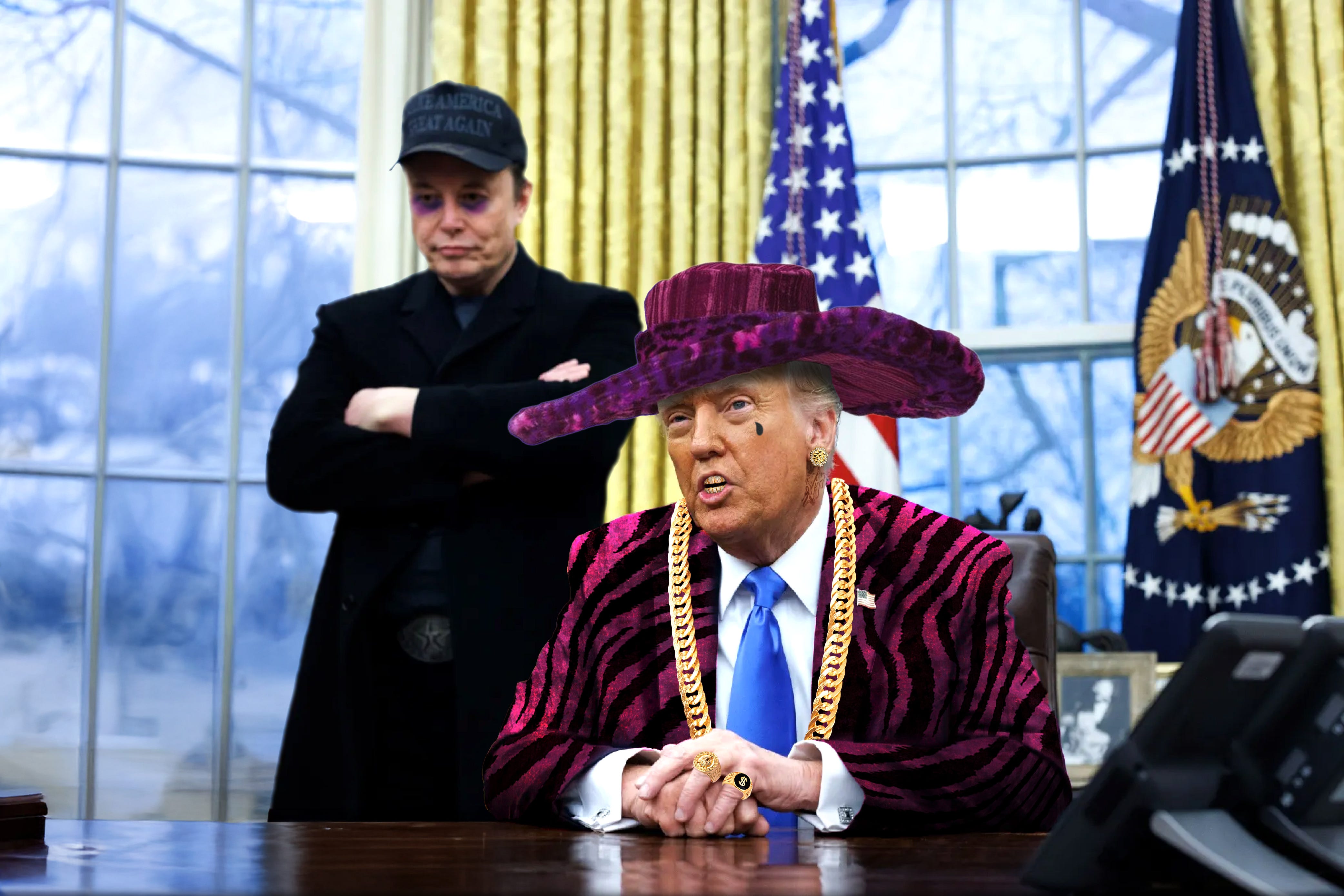 Musk, who was previously seen with a black right eye, sported two black eyes in the press conference, while Trump debuted a new purple velvet zebra print suit and hat, along with flashy gold jewelry.